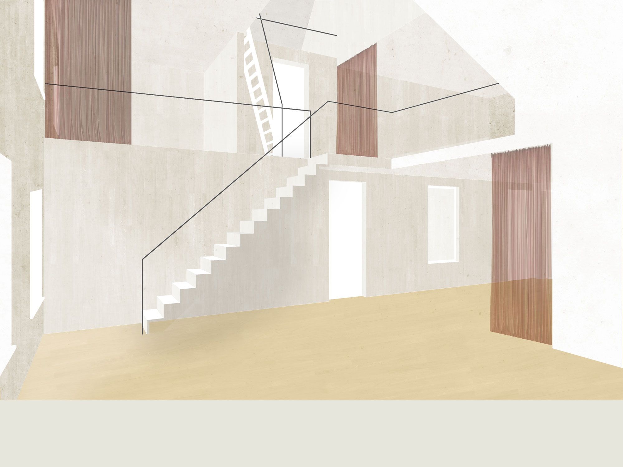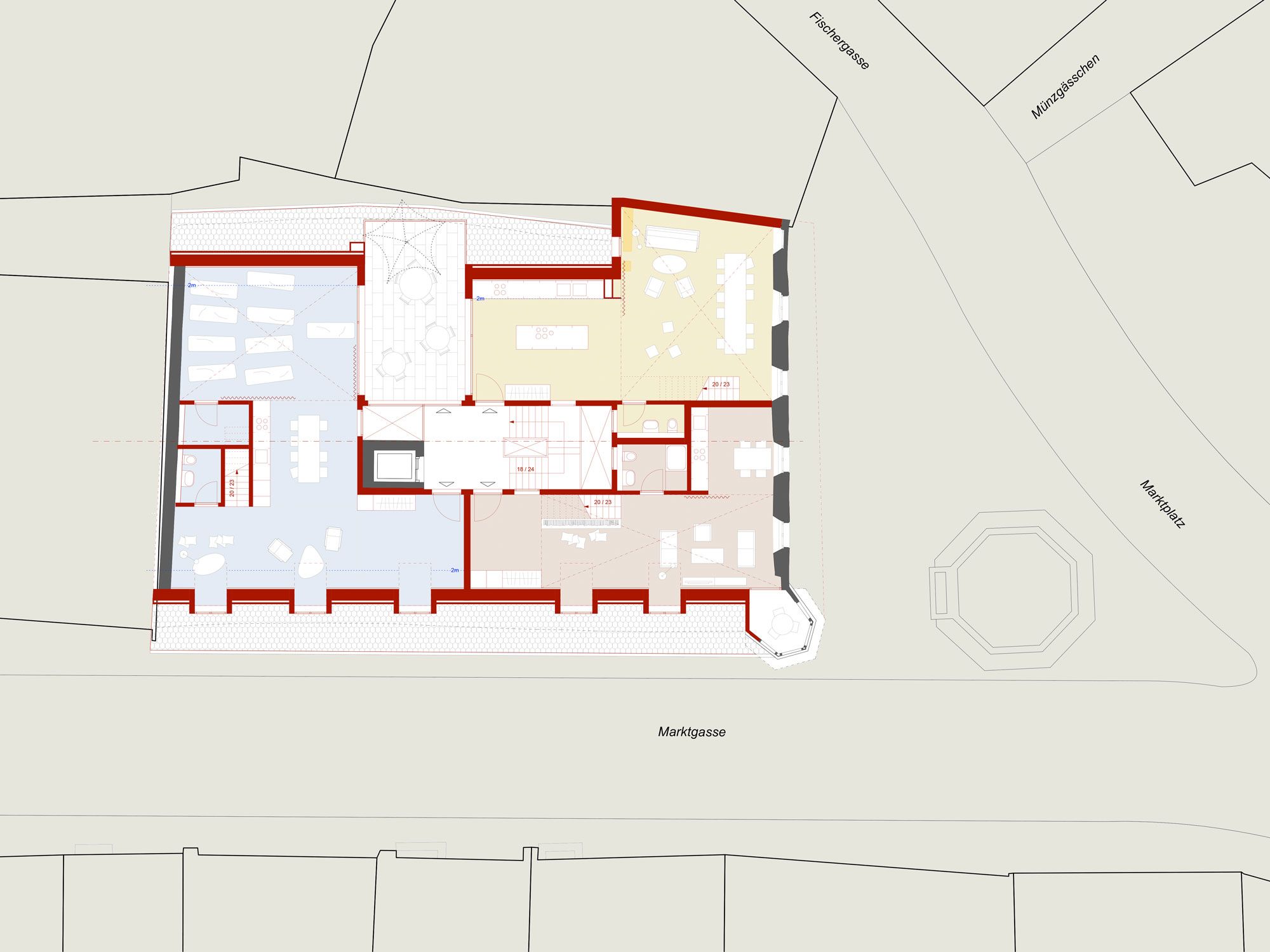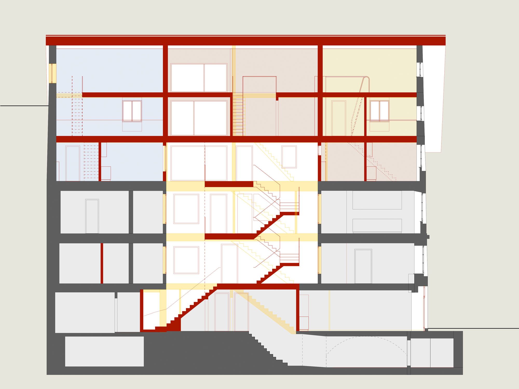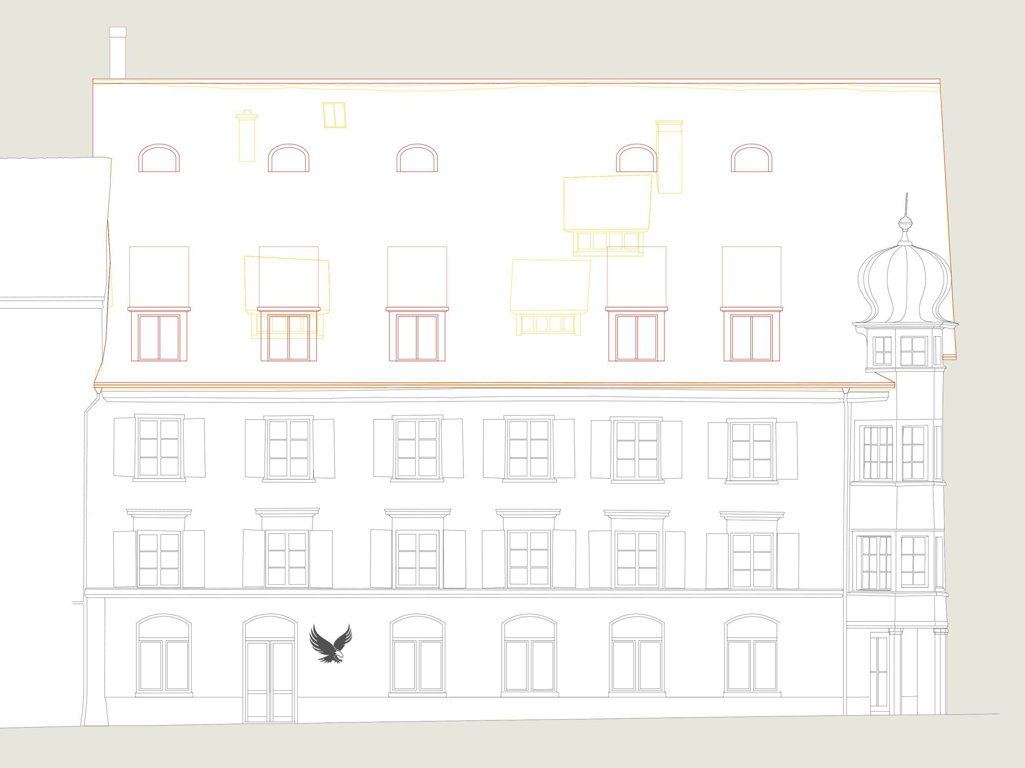 Die Struktur der einstigen drei Einzelgebäude wird mit einem neuen, räumlich vielseitigen und natürlich belichteten Treppenhaus bereinigt. Der marode Dachstuhl wird neu aufgebaut und bietet Platz für drei spannende und flexibel nutzbare Atelierwohnungen für publikumsorientierte Nutzungen. Bestehende Büroräume und Kleinwohnungen werden beibehalten, das Restaurant im Erdgeschoss wird aufgefrischt und erweitert.