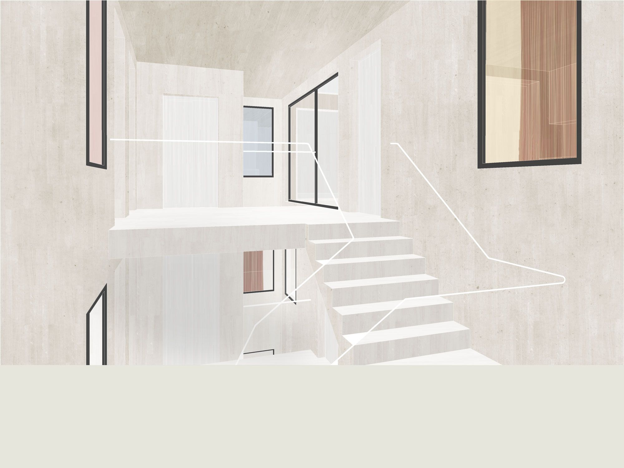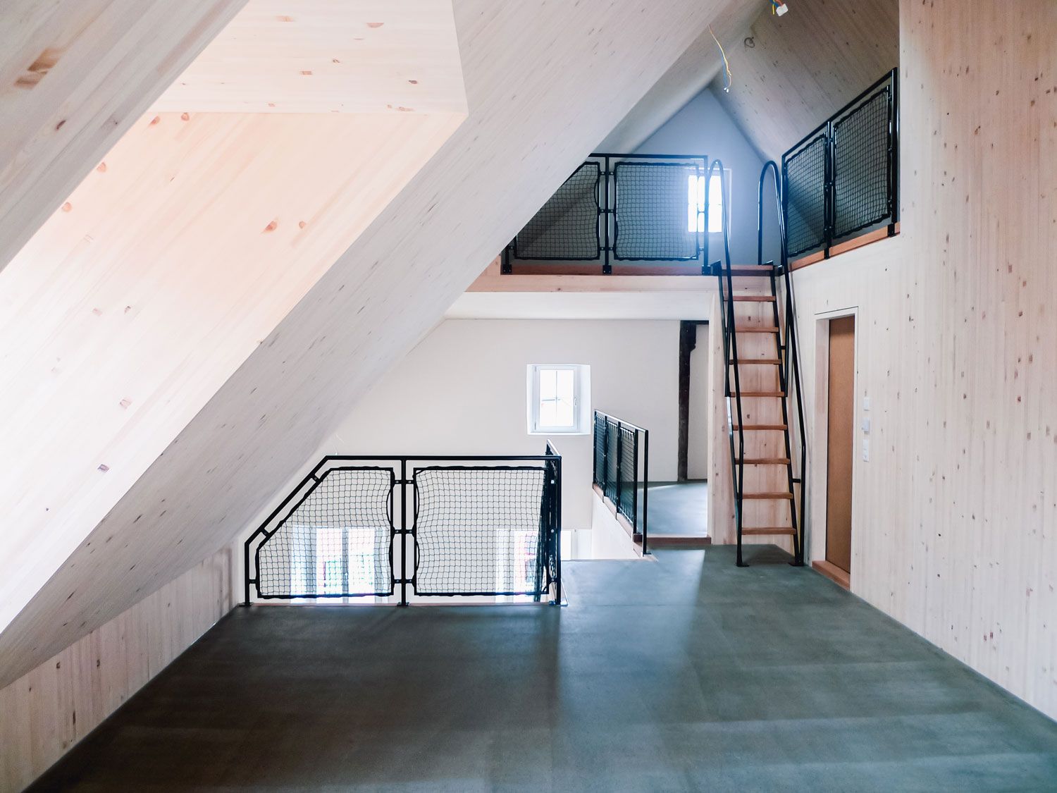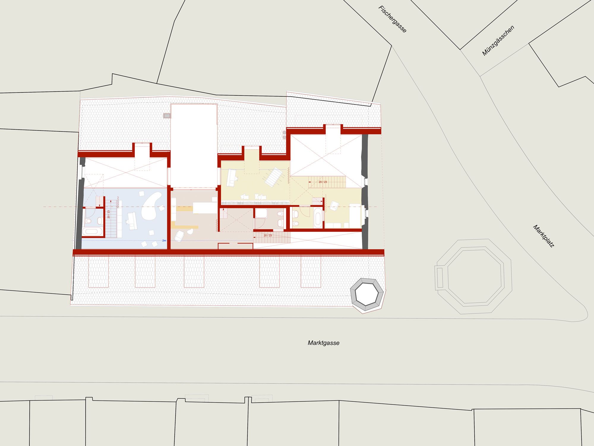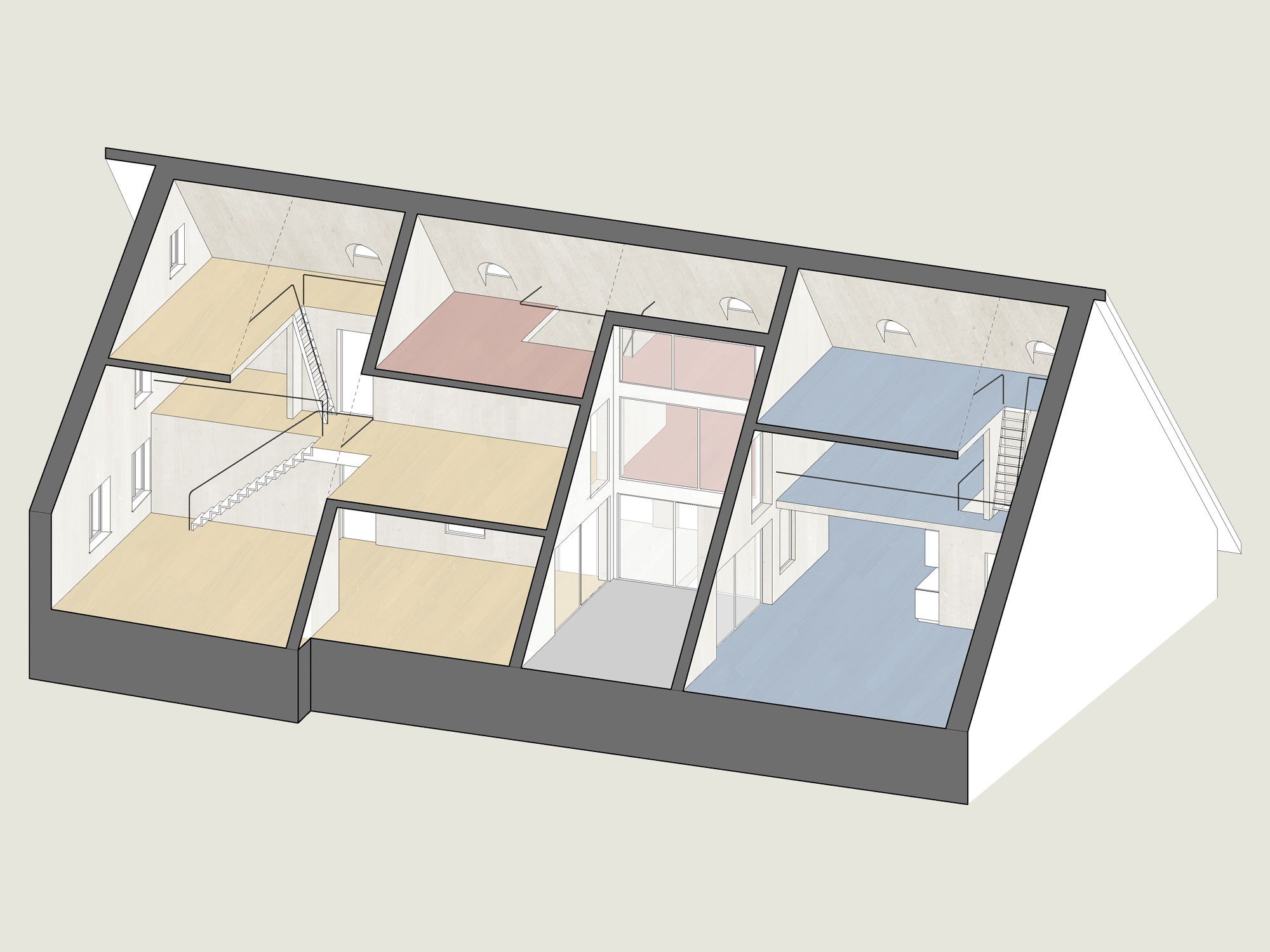 Die Struktur der einstigen drei Einzelgebäude wird mit einem neuen, räumlich vielseitigen und natürlich belichteten Treppenhaus bereinigt. Der marode Dachstuhl wird neu aufgebaut und bietet Platz für drei spannende und flexibel nutzbare Atelierwohnungen für publikumsorientierte Nutzungen. Bestehende Büroräume und Kleinwohnungen werden beibehalten, das Restaurant im Erdgeschoss wird aufgefrischt und erweitert.