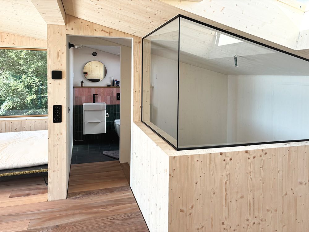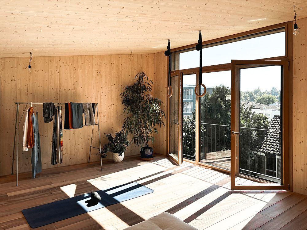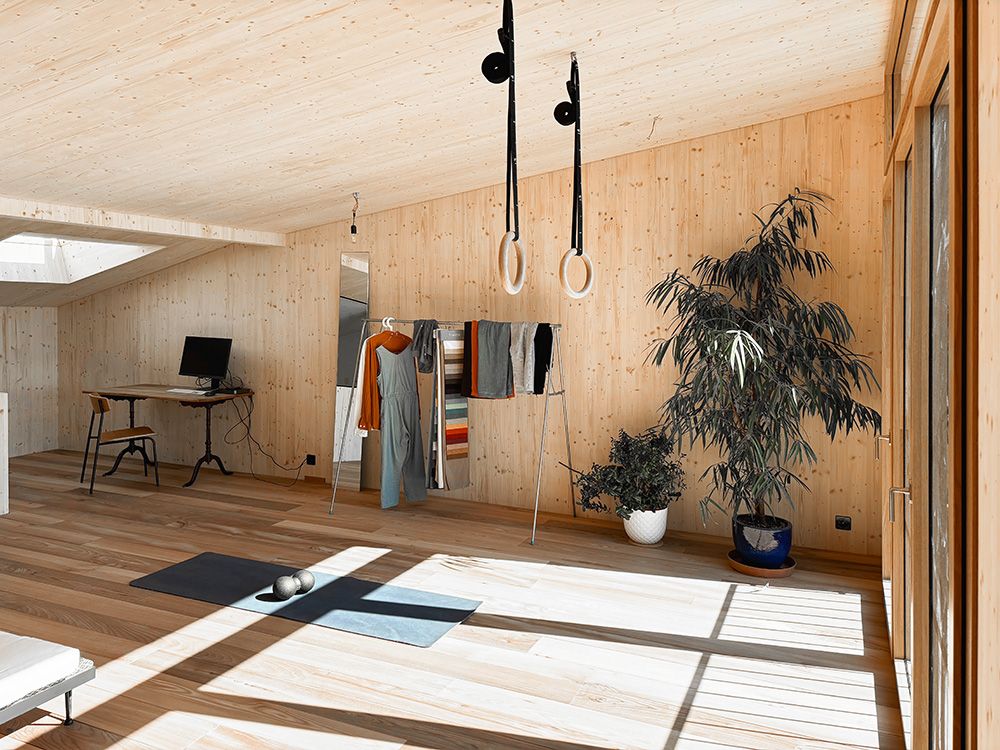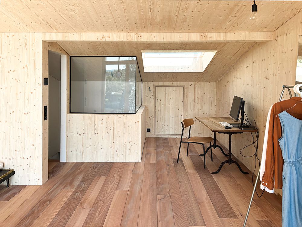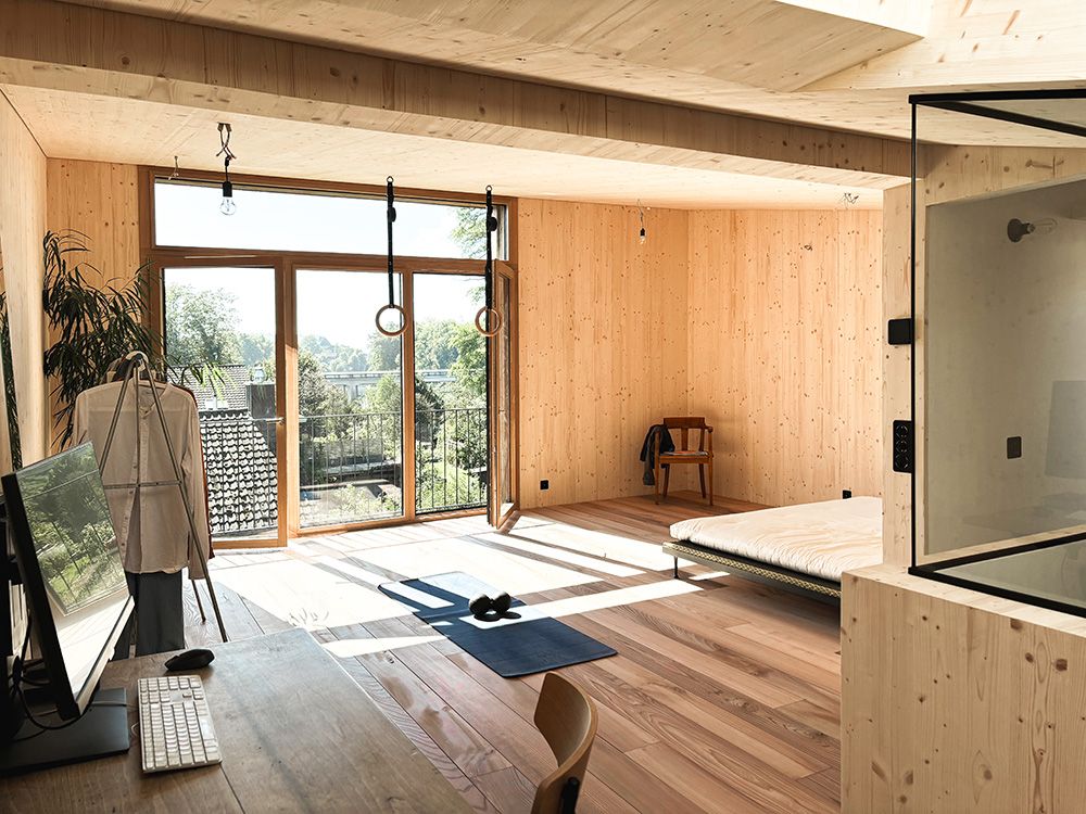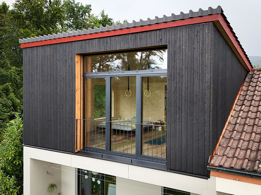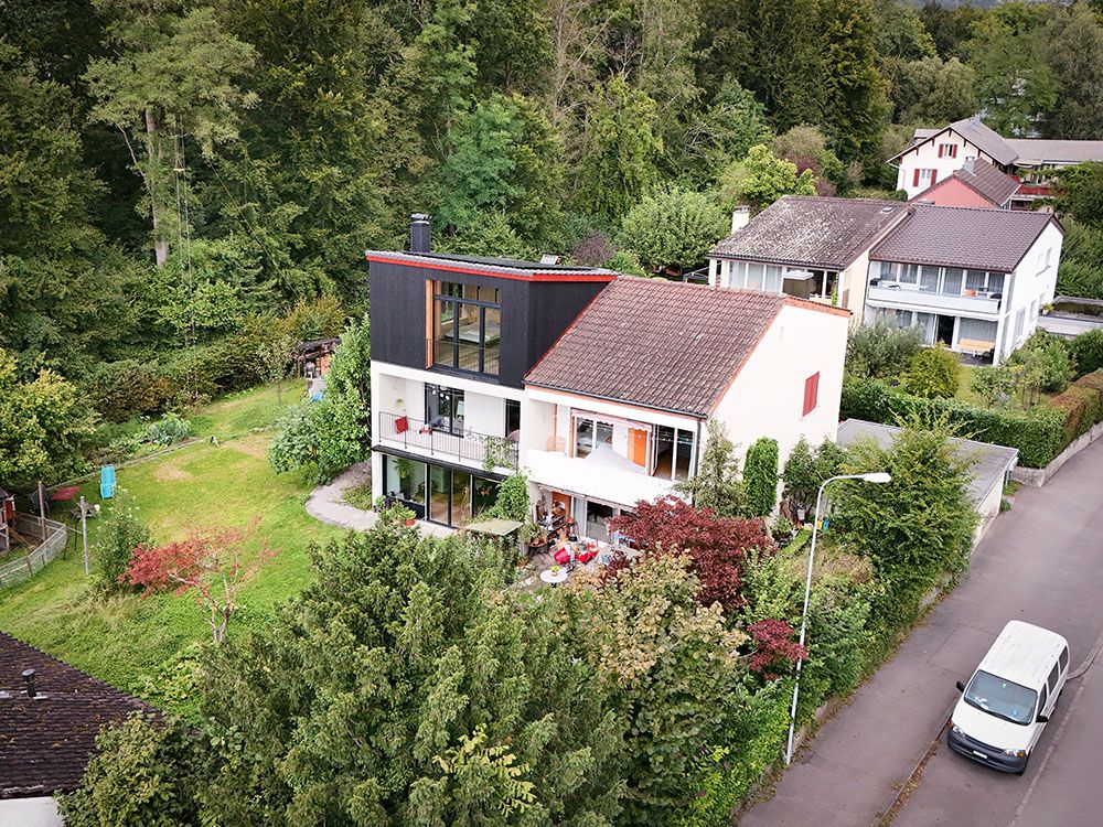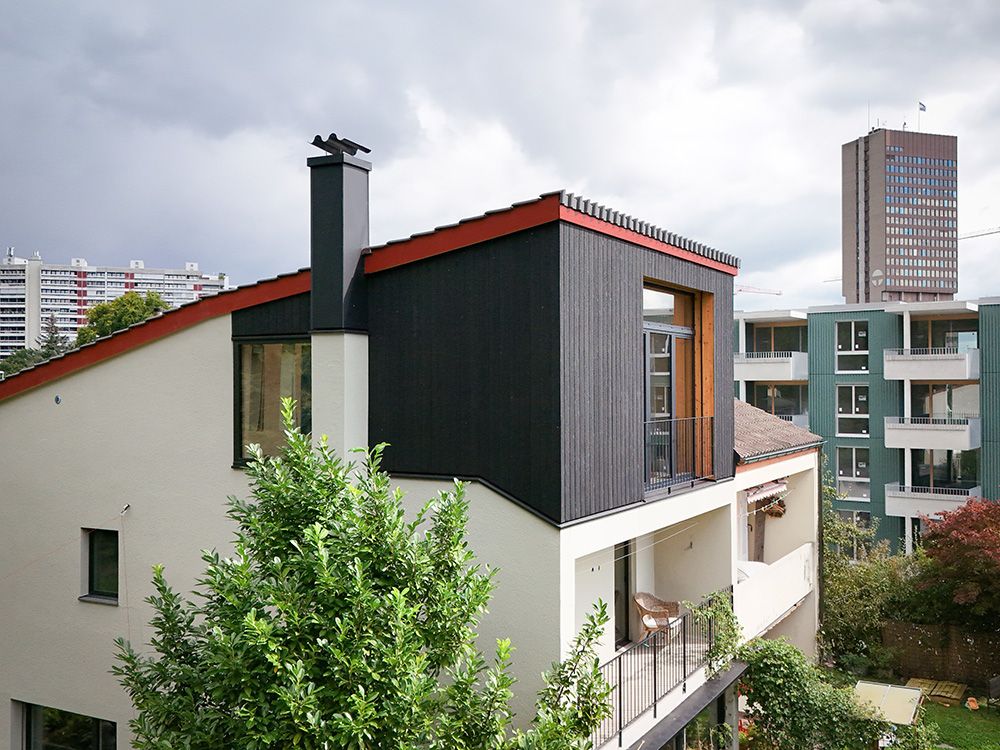 Um den räumlichen Bedürfnissen der Bewohnerschaft gerecht zu werden und den Wald als Qualität erlebbar zu machen, wurde mit einem Dachausbau eine Art Adlerhorst mit Waldbezug geschaffen. Das asymmetrische Satteldach wurde zu einem Pultdach erweitert und der neu gewonnene Raum mit Öffnungen auf mehreren Seiten ergänzt. Die Inneren Oberflächen sind in rohem Tannenholz belassen, die Aussenfassade zeigt sich nach einer uralten japanischen Technik in verkohltem Zedernholz.