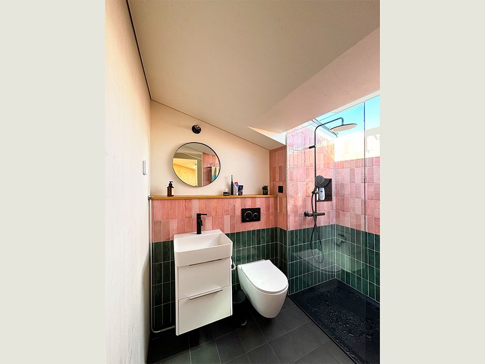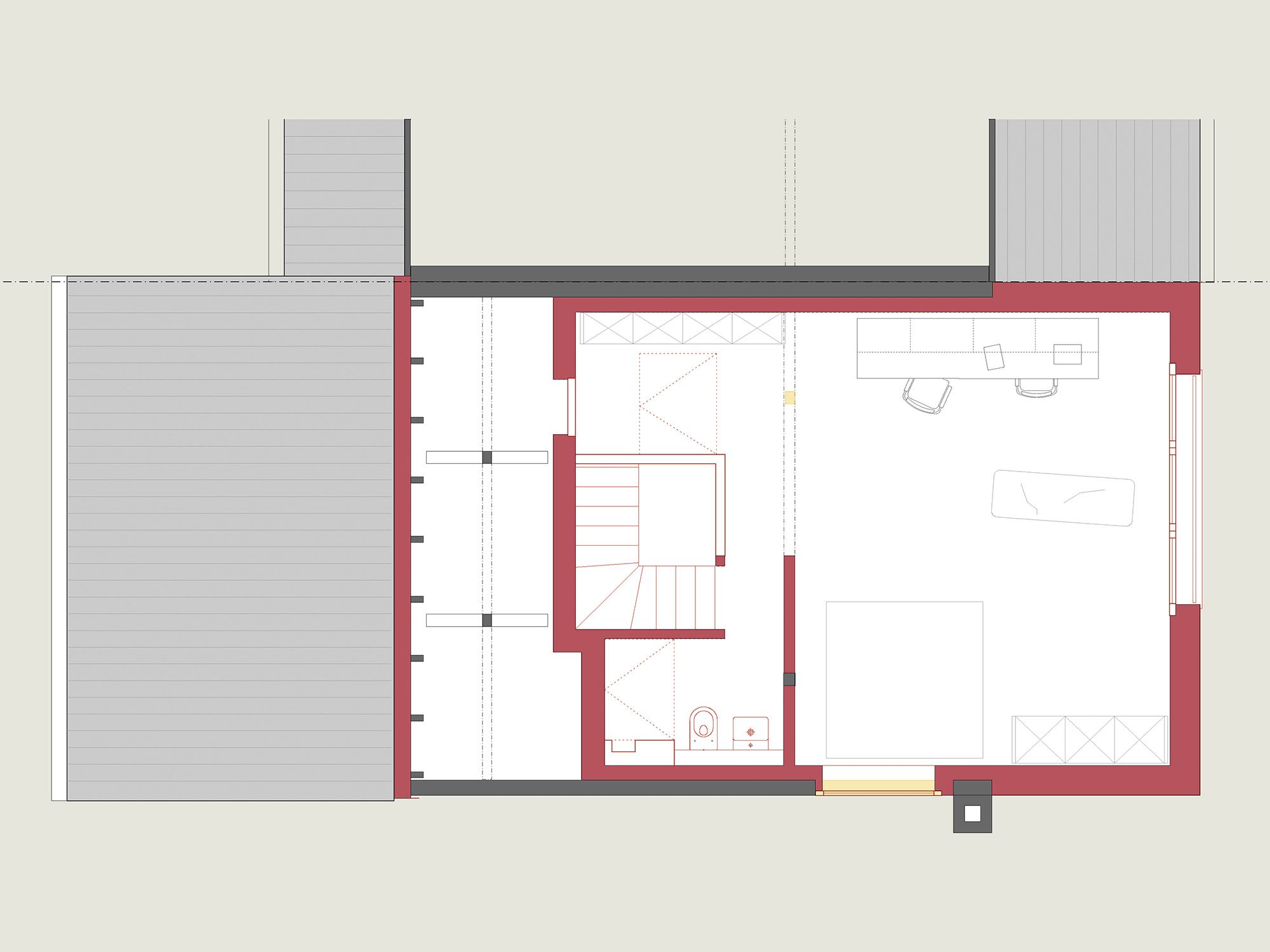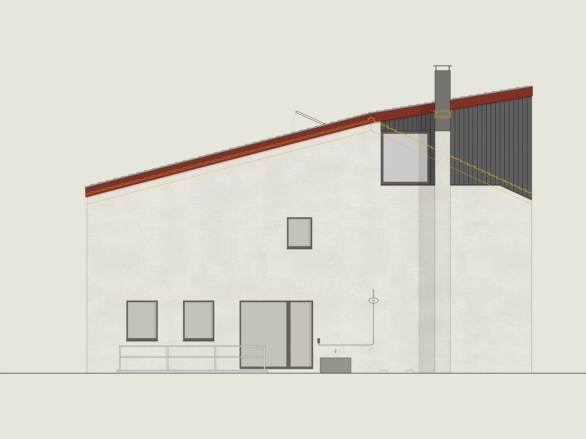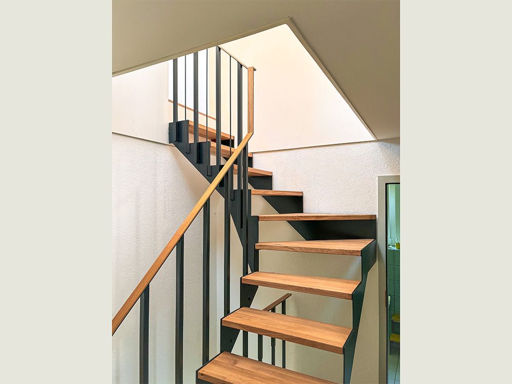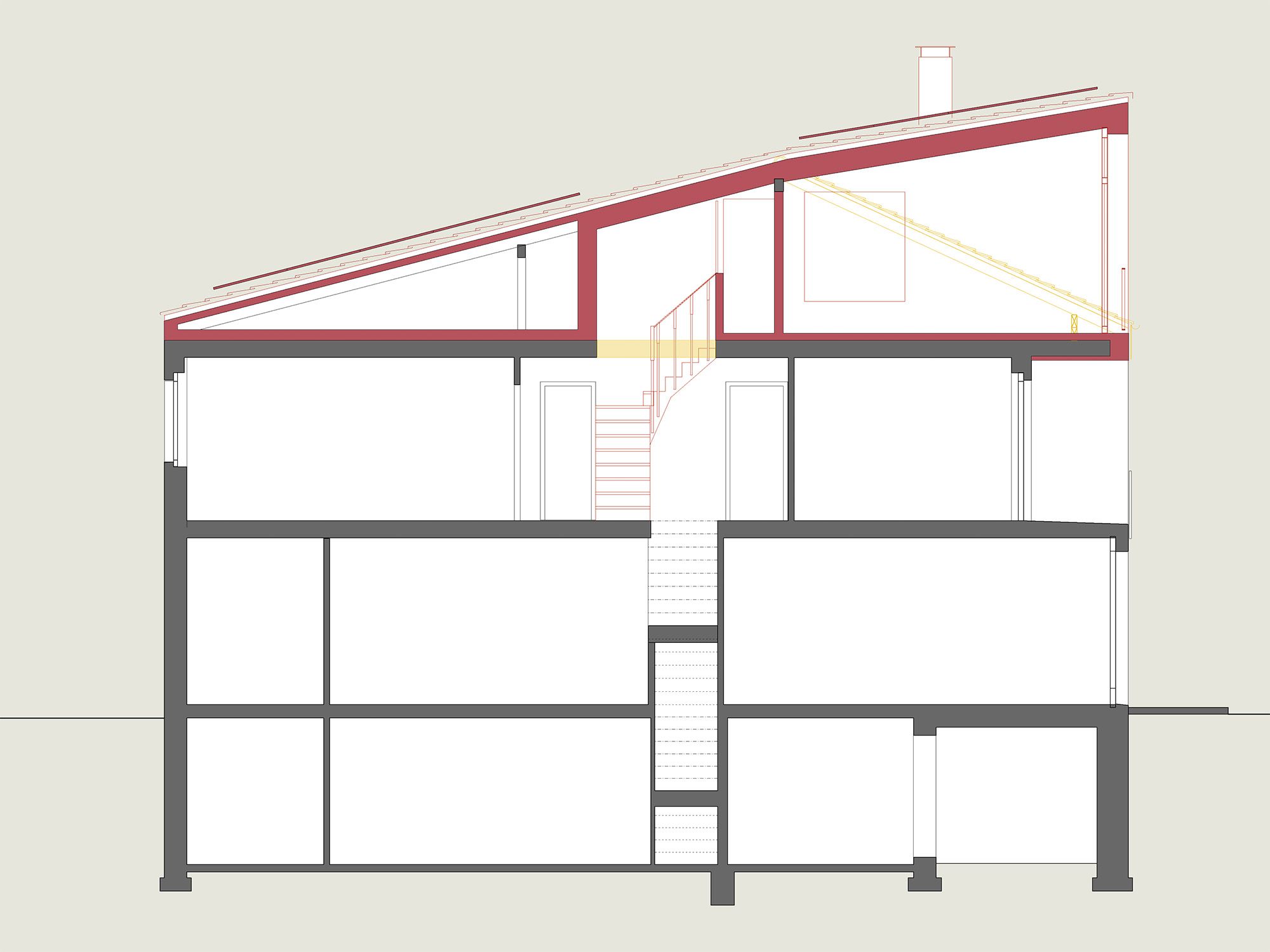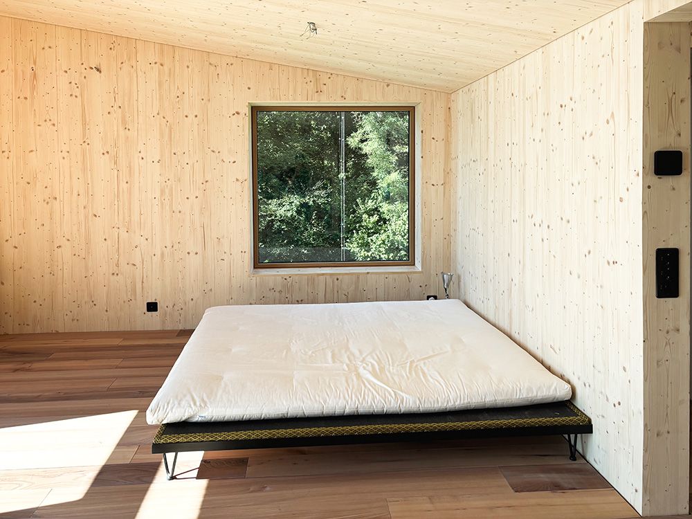 Um den räumlichen Bedürfnissen der Bewohnerschaft gerecht zu werden und den Wald als Qualität erlebbar zu machen, wurde mit einem Dachausbau eine Art Adlerhorst mit Waldbezug geschaffen. Das asymmetrische Satteldach wurde zu einem Pultdach erweitert und der neu gewonnene Raum mit Öffnungen auf mehreren Seiten ergänzt. Die Inneren Oberflächen sind in rohem Tannenholz belassen, die Aussenfassade zeigt sich nach einer uralten japanischen Technik in verkohltem Zedernholz.