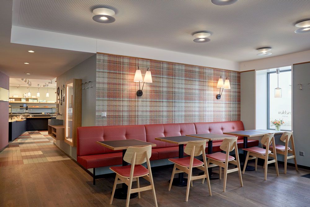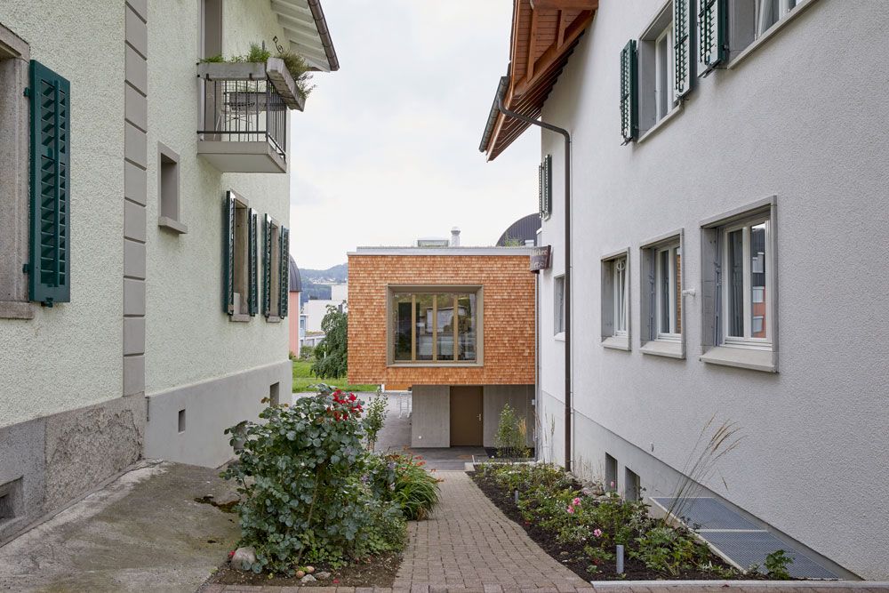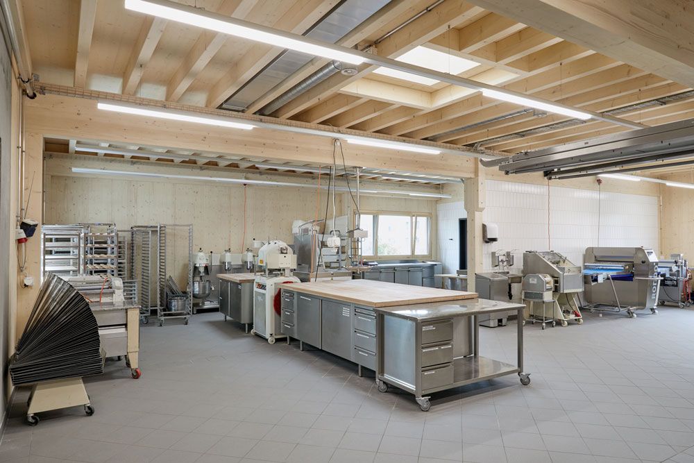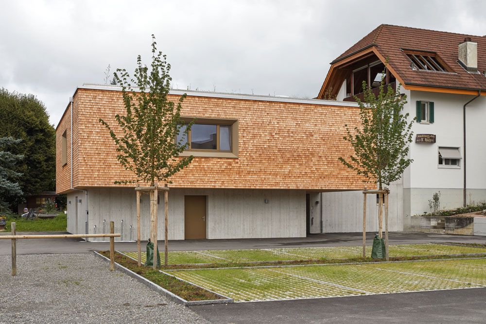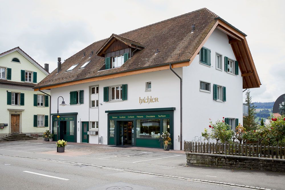 Für die Traditionsbäckerei Hächler wurde durch einen Anbau die neu benötigte Produktionsfläche generiert. Die alte Backstube im Hauptgebäude wurde zugunsten einer modernen Verkaufsfläche mit Café aufgelöst und bildet einen Mehrwert für den öffentlichen Raum im Dorfkern von Seengen. Der massive Sockel des Anbaus wächst aus der umliegenden Ebene, trägt den Produktionsteil und verbindet sich über einen Zwischenbau mit dem Hauptgebäude. Der eigentliche Produktionsbereich ist als einfacher Quader in Holzbauweise mit einer Schindelfassade ausgeführt. Die Handwerkskunst der Schindelfassade versinnbildlicht die Arbeits- und Produktphilosophie der Bäckerei Hächler. Die publikumswirksamen Nutzungen von Verkaufsladen und Café werden über eine neue Ladenfassade zur Dorfstrasse präsentiert.