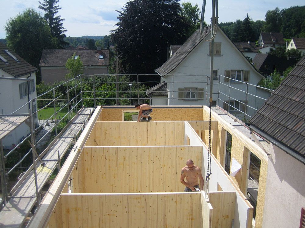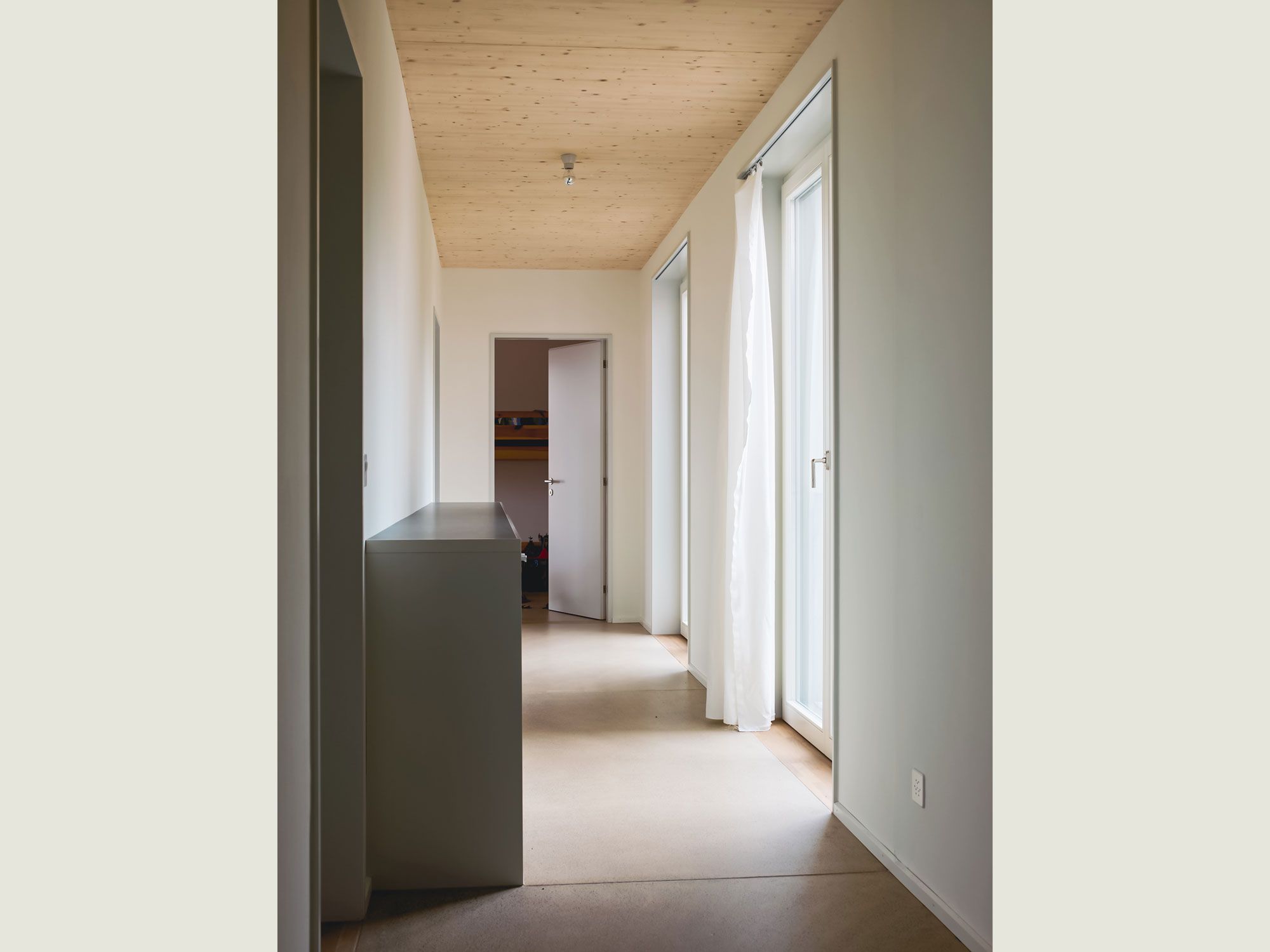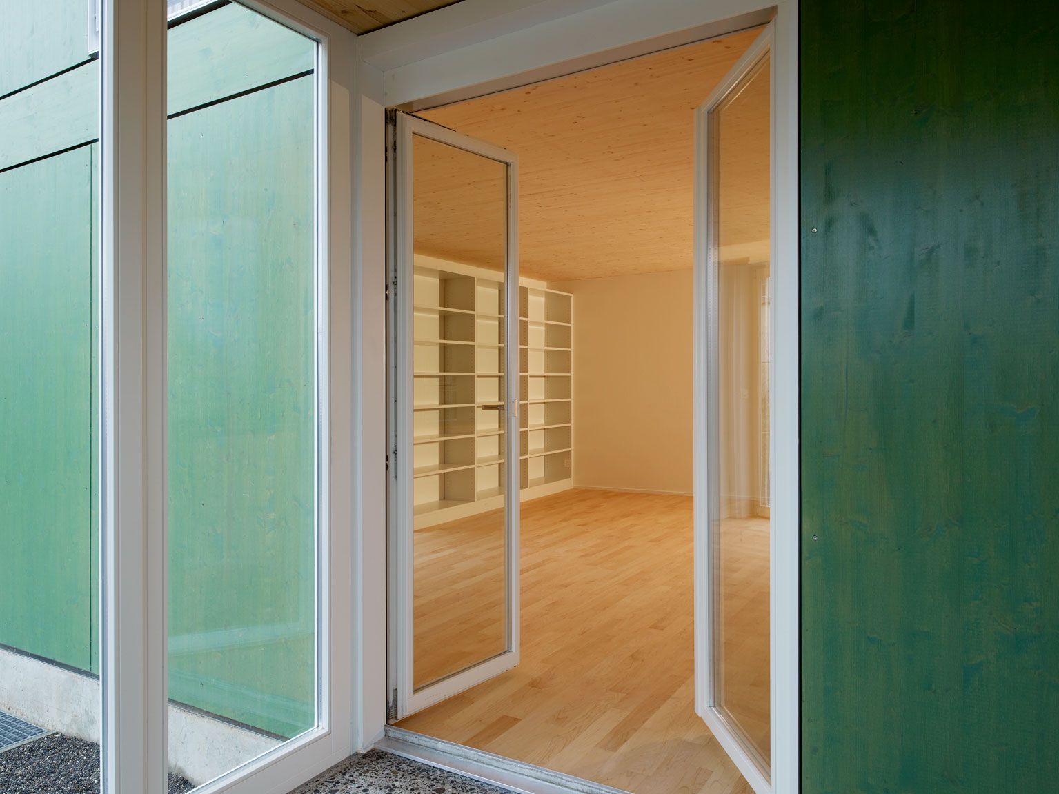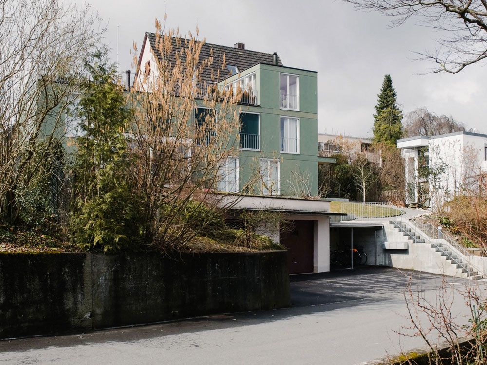 Der talseitig an ein bestehendes Einfamilienhaus gesetzte Holzelementbau verdoppelt das Bauvolumen und erweitert das EFH zu einem Mehrgenerationenhaus mit drei unabhängig erschlossenen Wohneinheiten und entsprechend zugeordneten Gartenbereichen. Der Neubau ergänzt die einzelnen Geschosse des bestehenden Hauses zu selbstständigen Wohnungen. Alt und Neu stehen in Materialisierung, Raumstruktur und Farbgebung komplementär zueinander. Ein kleines Attika schafft die Verknüpfung der beiden Körper und ermöglicht die Nutzung des Flachdaches als attraktive Terrasse. In der Anlage besteht innen und aussen eine Vielfalt an Verbindungen und Wegbeziehungen. Sie ermöglicht eine grosse Flexibilität für sich verändernde Raumansprüche.