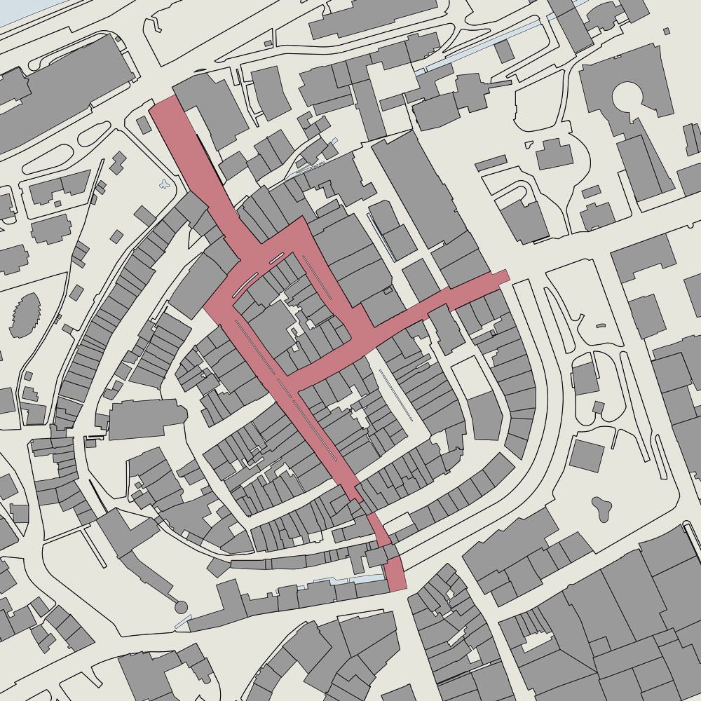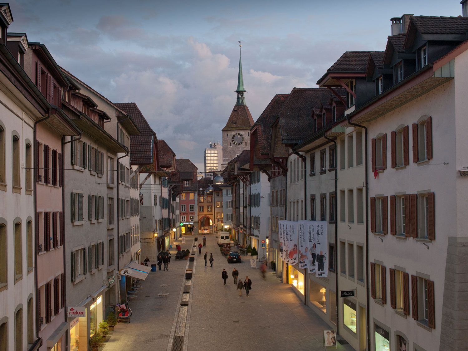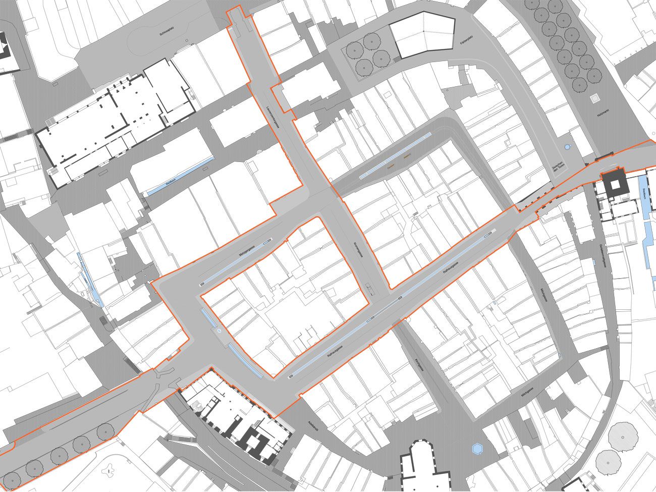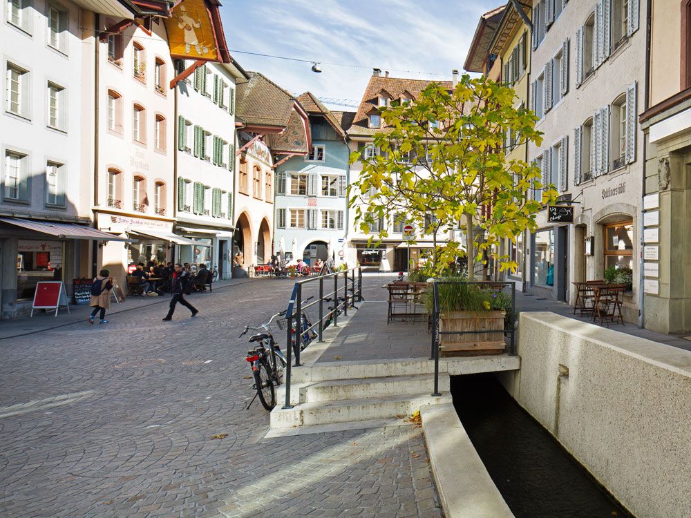 Die Altstadtgassen sind ausserordentlich schön gefasste Räume. Ein klassisch gepflästerter Bodenbelag mit einer aus dem Stadtbach gespiesenen Wasseranlage, eine angenehme Gassenbeleuchtung und eine funktionale Ausrüstung für besondere Anlässe sind die neuen baulichen Elemente. Die mit Gusseisen eingefassten und mit Weisskopfstein gepflästerten Wasserrinnen setzten das dosiert eingeführte Stadtbachwasser in Szene. Brunnenelemente markieren die einzelnen Rinnenabschnitte. Die frei einsetzbaren Roste über der Rinne ermöglichen örtlich die Überquerung oder überdecken die Rinne als Ganzes während Grossanlässen. Die Gestaltung der Bodenflächen markiert die Nutzungszonen. Die archäologisch erfassten Fundamente der mittelalterlichen Tore in der Laurenzentorgasse und am Zollrain werden im Boden in Beton nachgezeichnet.