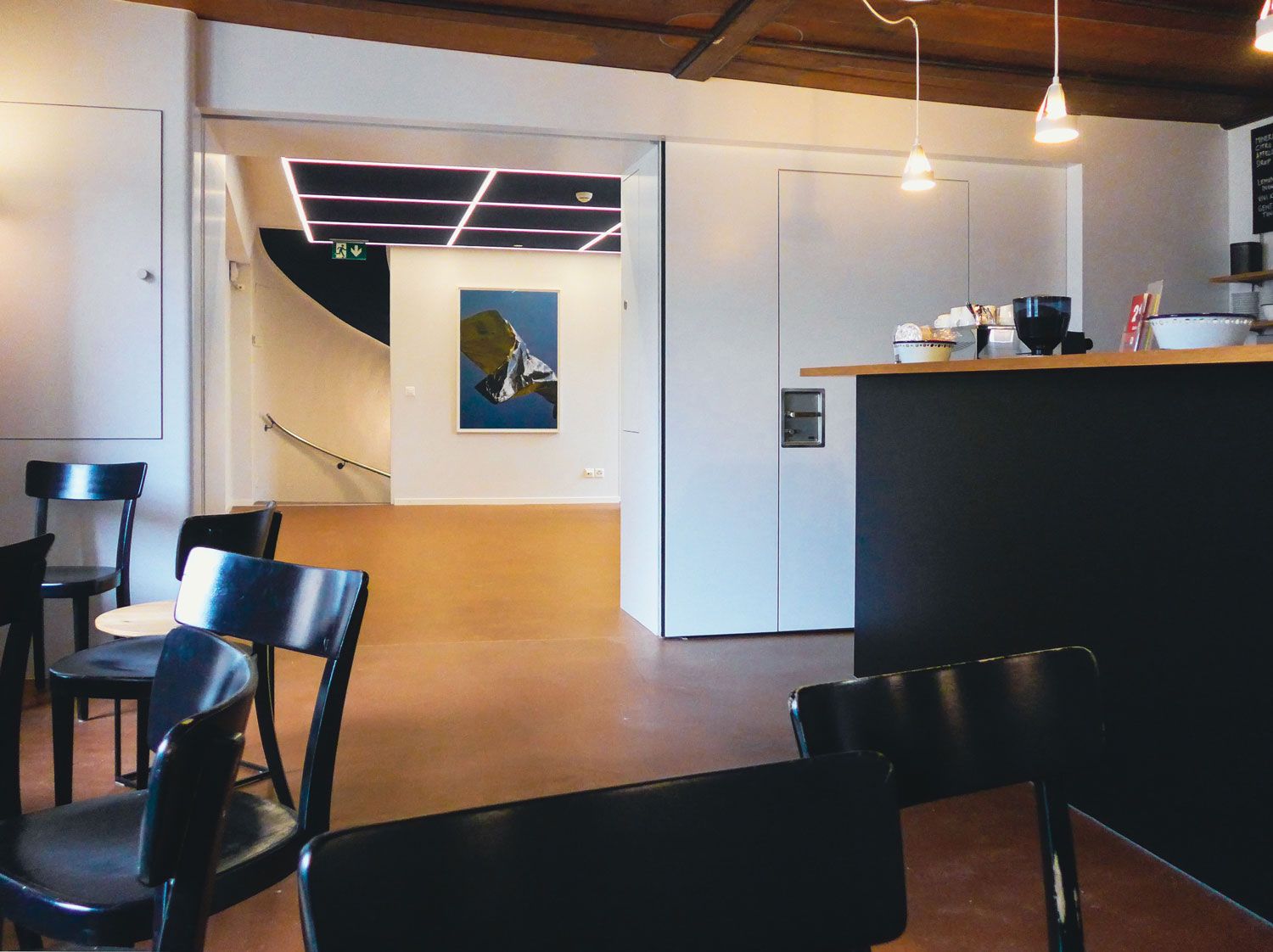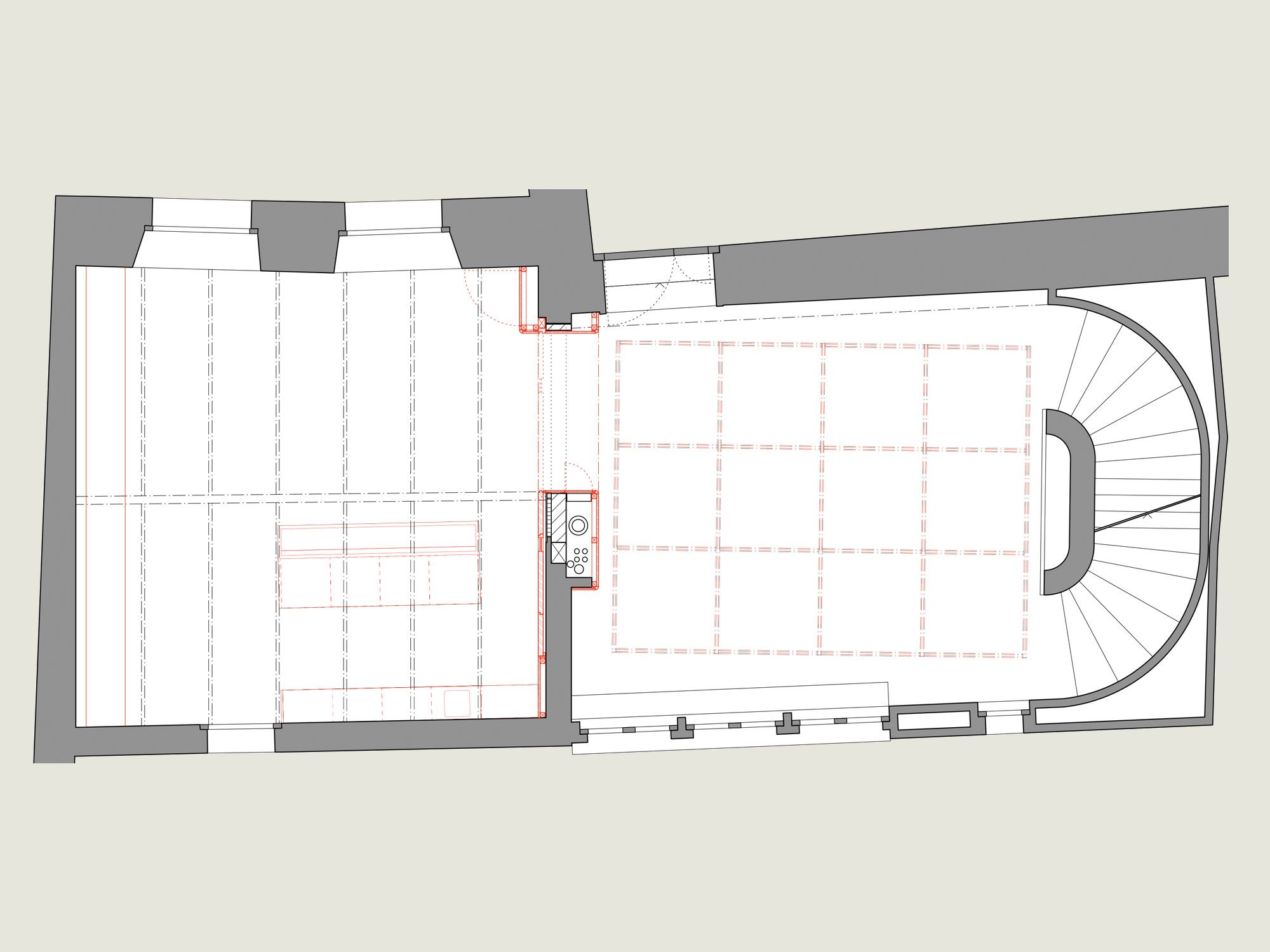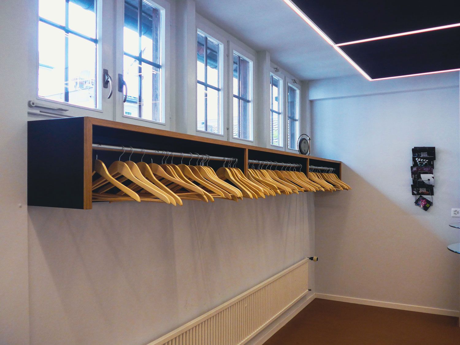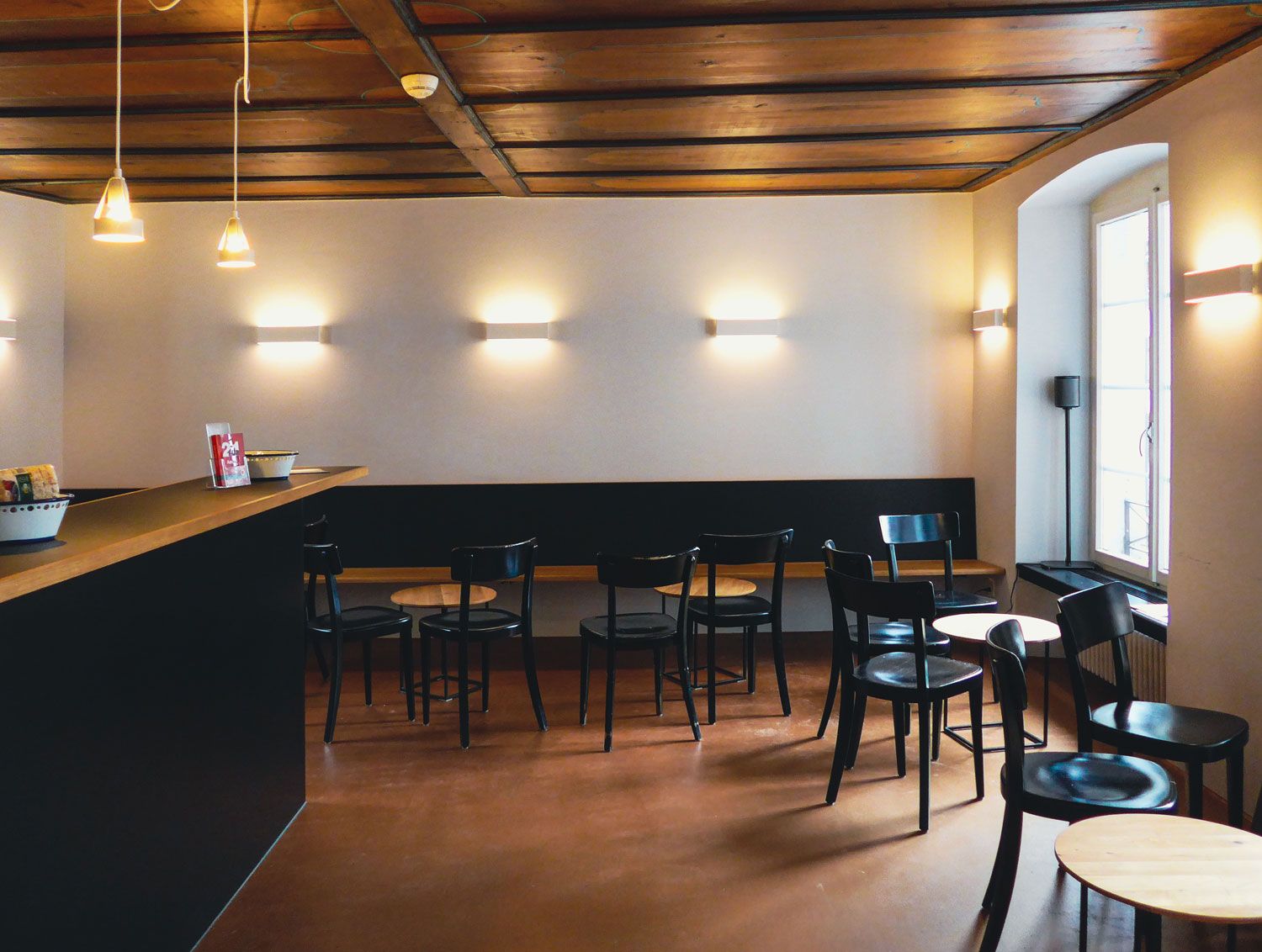 Die Verbindung zwischen Foyer und Bar wird räumlich und optisch durch einen breiteren Durchgang vergrössert und durch den vereinheitlichten, kupferfarbenen Boden gestärkt. Dadurch gewinnt der Publikumsfluss zwischen Bar-Foyer-Theater an Raum und Klarheit. Die neue, um 90° gedrehte Bar steht stärker im Gangfluss und beruhigt gleichzeitig den Sitzbereich mit neuer Sitzbank. Im Foyer ist die Garderobe aus dem Besucherstrom wegversetzt und eine abgehängte Beleuchtungs-/Akustikdecke unterstützt die gewünschte Raumstimmung.