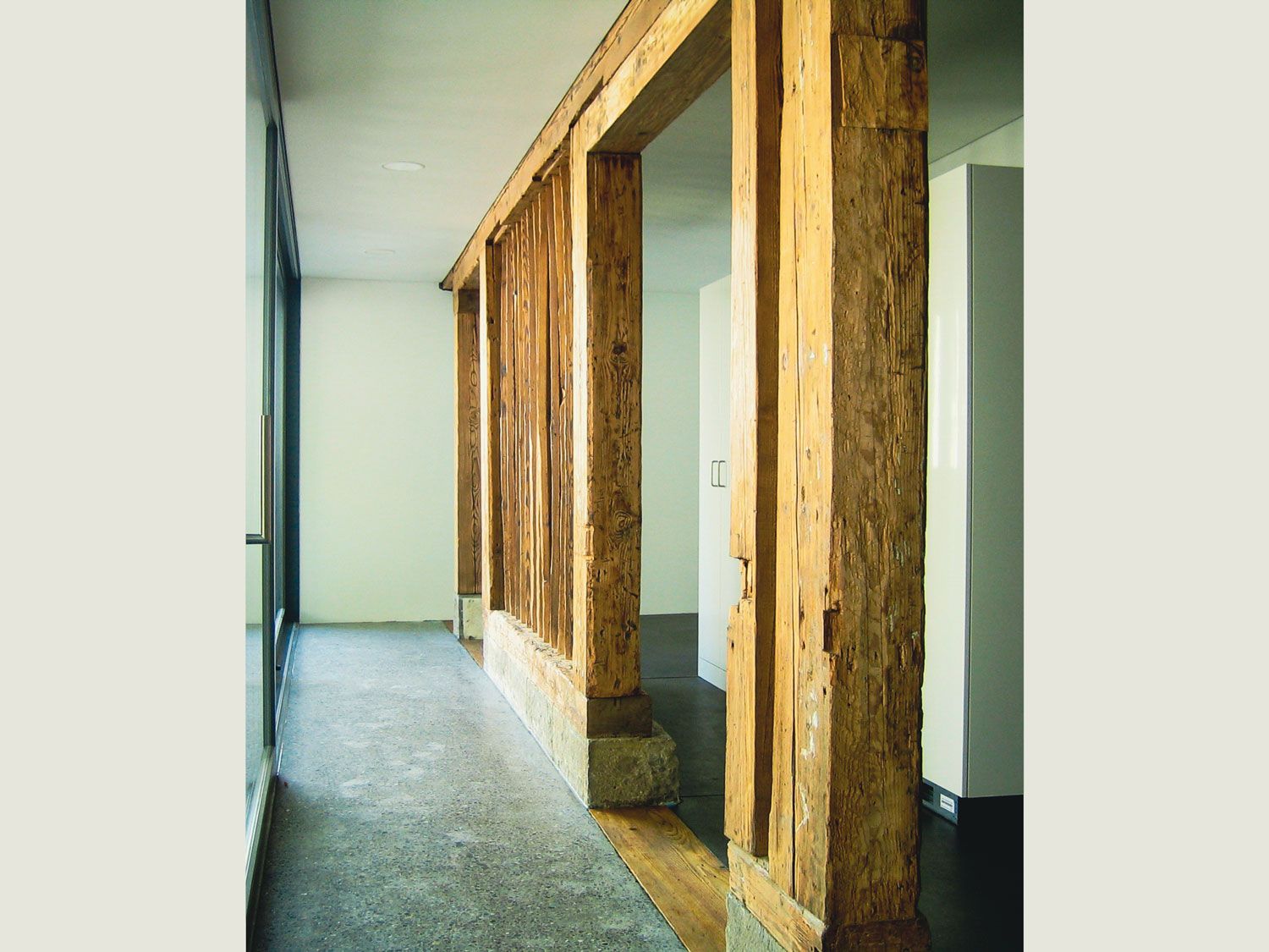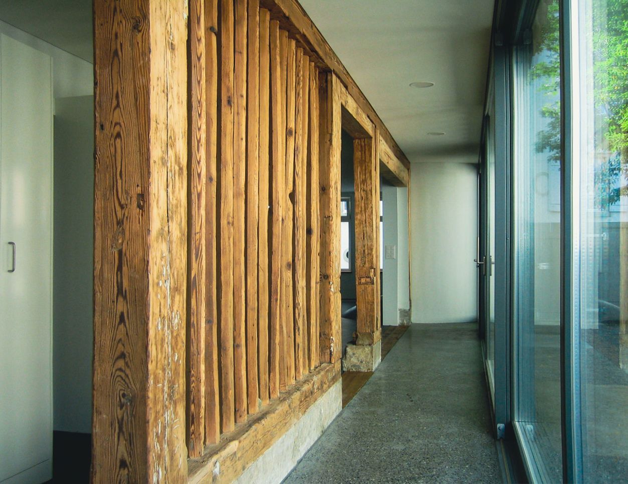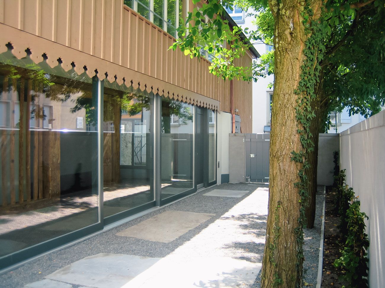 Hinter der historischen Häuserzeile an der Laurenzenvorstadt herrscht eine leicht exotische Idylle. Das vorliegende Projekt wahrt und unterstreicht diese Stimmung. Alt und Neu greifen ineinander. Eine neue Mauer begrenzt einen Gartenhof. Innen- und Aussenraum sind durch eine Glashaut klimatisch getrennt. Das Projekt umfasst drei Eigentumswohnungen mit offenem Grundriss für ein bis zwei Personen. Die Einheiten sind weitgehend identisch in Grundriss und Ausstattung, weisen jedoch entsprechend der Lage innerhalb des Gebäudes eine eigene Charakteristik auf.