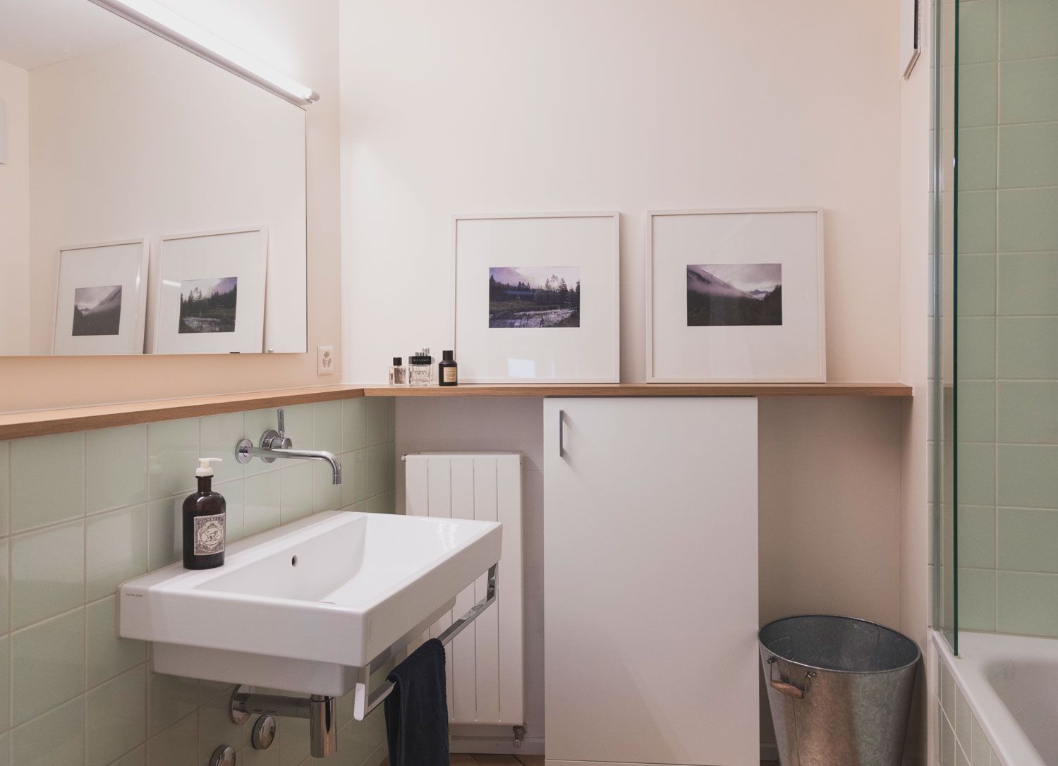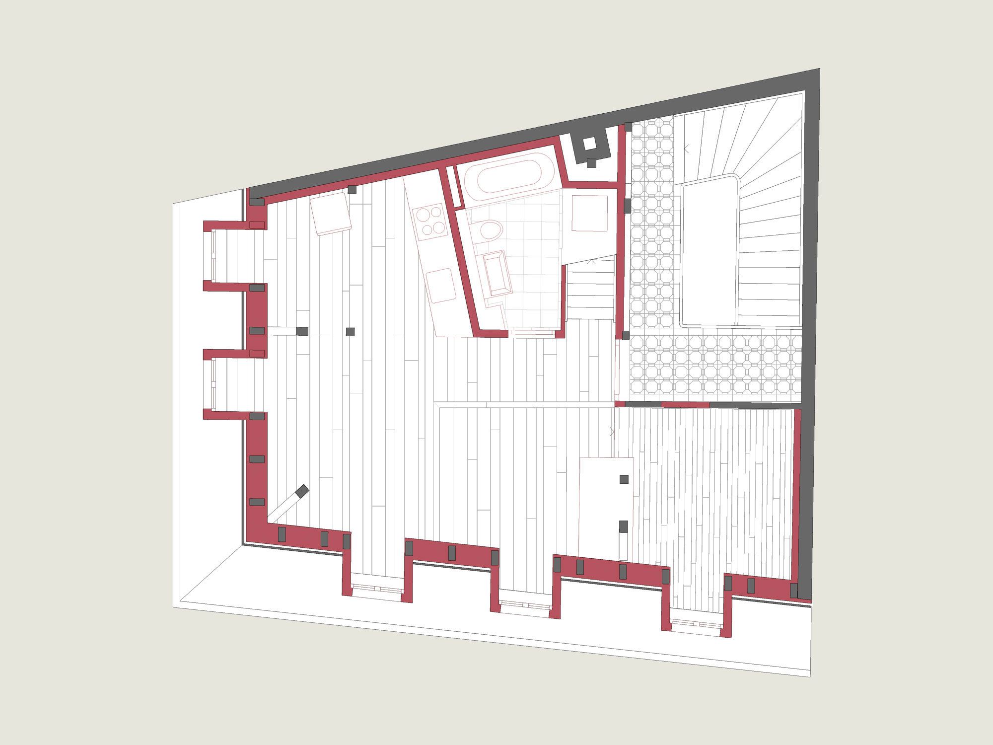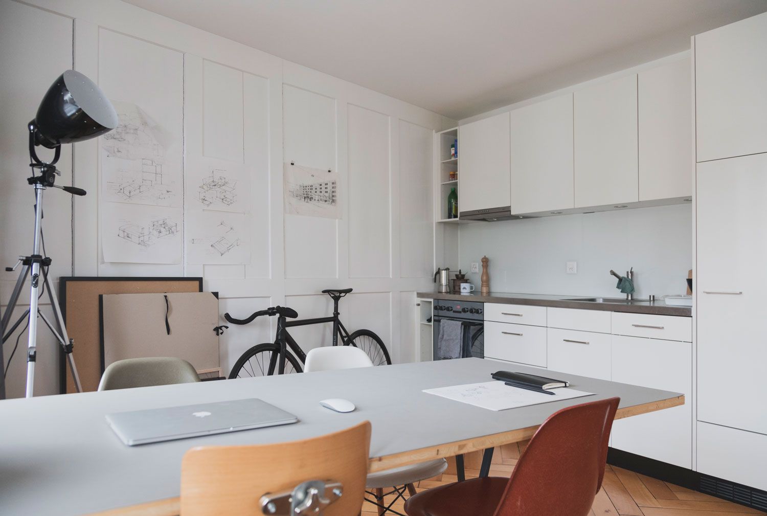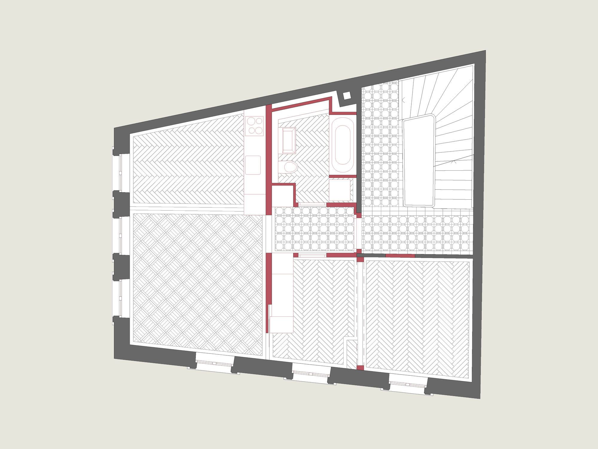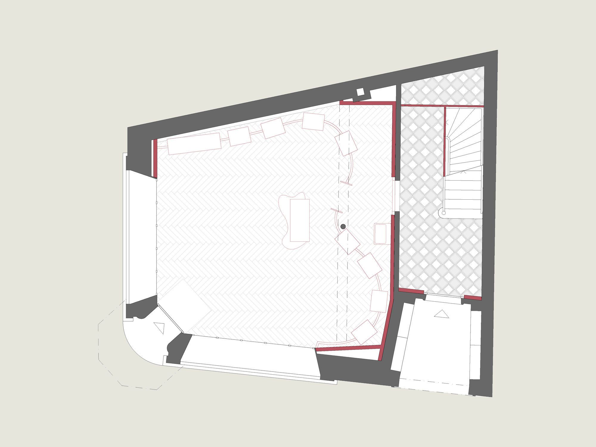 Die Umbauarbeiten des Wohn- und Geschäftshauses sind mit der Absicht erfolgt, eine zeitgemässe räumliche und technische Erneuerung zu erreichen, ohne das Wesen des Gebäudes grundlegend zu verändern. Das gesamte Gebäude mit Dachstuhl und den gut erhaltenen, vielfältigen Bodenbelägen wurde für die Planung genaustens aufgenommen. Das natürlich belichtete Treppenhaus wurde beispielsweise durch Malerarbeiten mit Bierlasur sorgfältig restauriert und erscheint heute wieder in alter Frische. Die Anpassungen an den Grundrissen erfolgte entsprechend mit dem Ziel, die Bodenbeläge auf die neue Situation zu adaptieren. Dies führt zu interessanten Raumabfolgen mit vielen Zitaten aus vergangenen Zeiten.