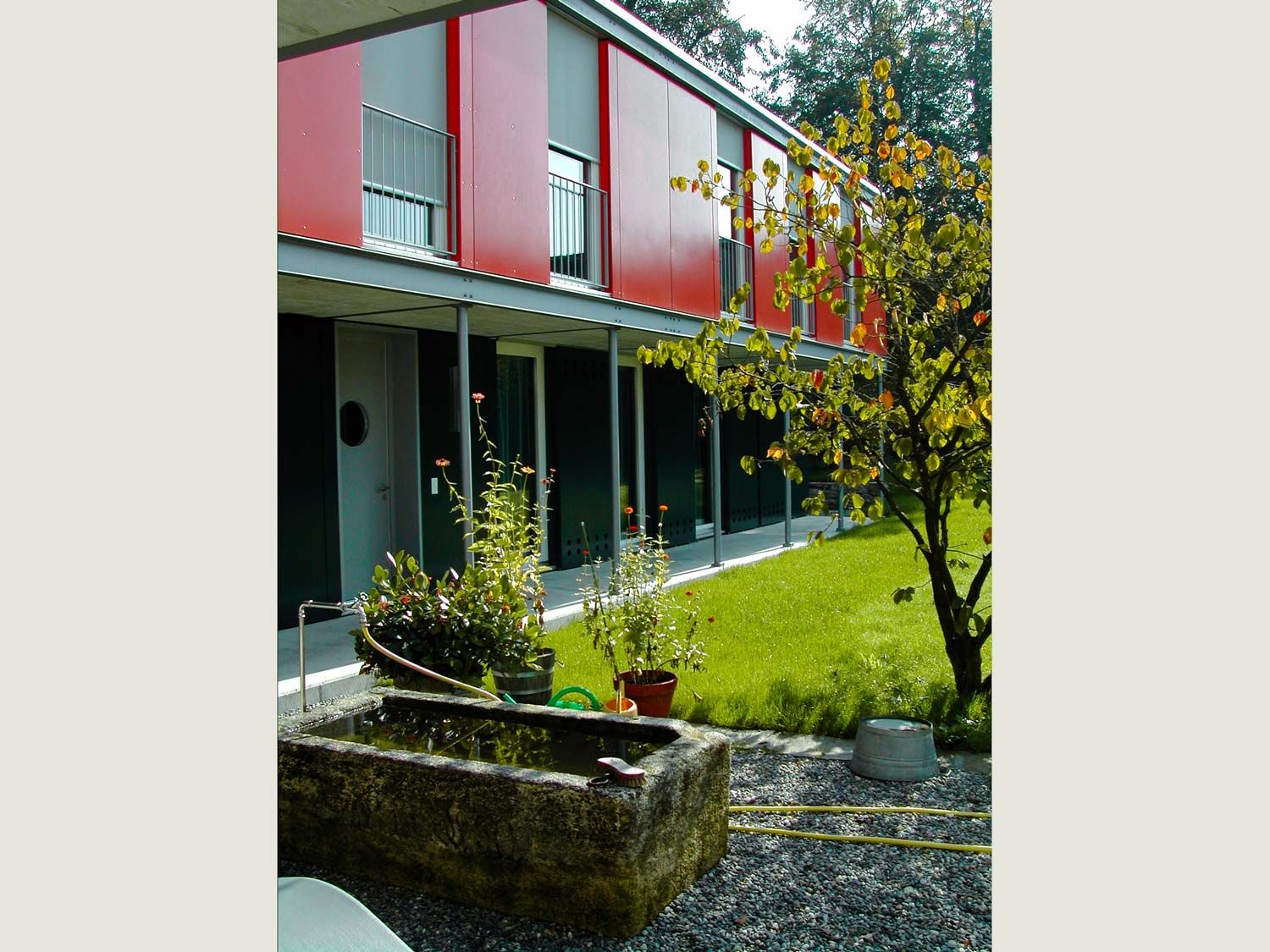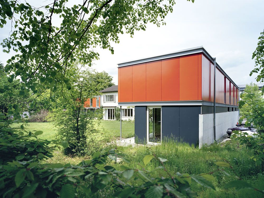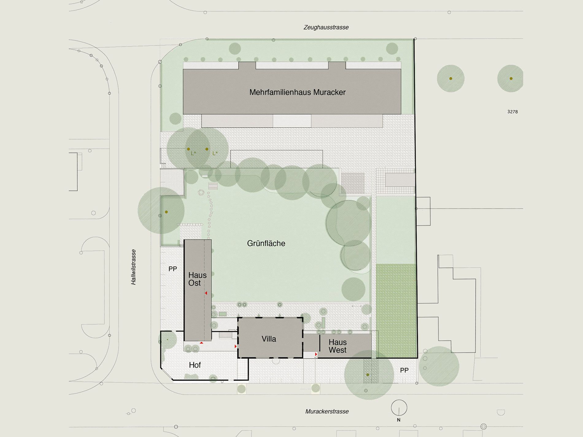 Die Erbengemeinschaft will mit der Erweiterung der Wohnanlage die zentrale Stellung der bestehenden Villa mit Gartenanlage respektieren und trotzdem eine massvolle Verdichtung des Ensembles erreichen. Wie bei der städtebaulichen und sozialen Situation basieren auch das architektonische Konzept und die Materialisierung auf Unterschiedlichkeit und Verwandtschaften. Dem renovierten, massiven Altbau wird eine Stahlkonstruktion mit Plattenverkleidung beigestellt. Die Schlichtheit in der Gestaltung, der Einsatz einer optisch prägenden Stahlkonstruktion und eine direkte natürliche Materialisierung sind Gemeinsamkeiten der unterschiedlichen Bauten.